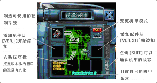 机甲有初形机甲[VER.0]和升级过的机甲[VER.1][VER.2]3种。制造机甲时登陆机甲。机甲界面是了解机甲的能力及状态,着装追加配件及程序卡的地方